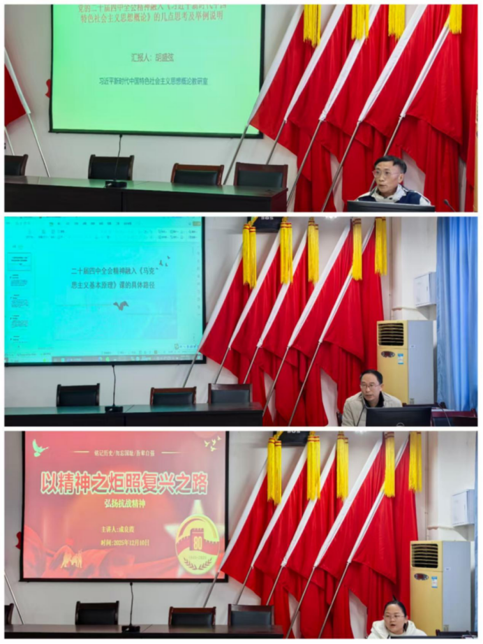 在交流环节,各教研室代表结合各自课程特点,围绕党的二十届四中全会精神融入思政课教学提出多样化思考。胡盛弦老师结合《习近平新时代中国特色社会主义思想概论》课教学实际,从为什么要融入,如何融入,融入后的预期效果三方面为切入口,引导学生深刻理解坚持和完善中国特色社会主义制度、推进国家治理体系和治理能力现代化的核心要义与实践要求。